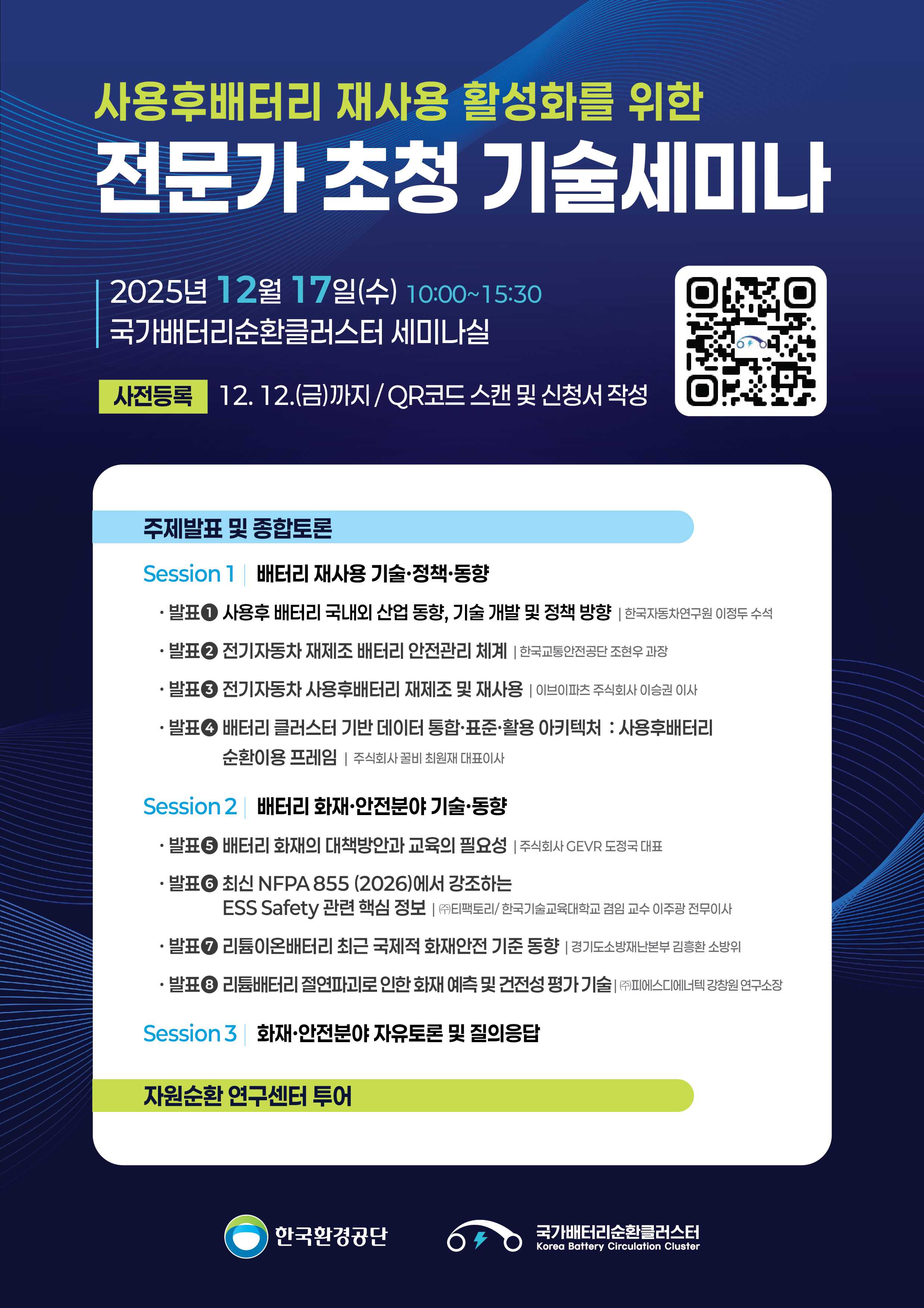 『사용후배터리 재사용 활성화를 위한 전문가 초청 기술세미나』가 개최됩니다.